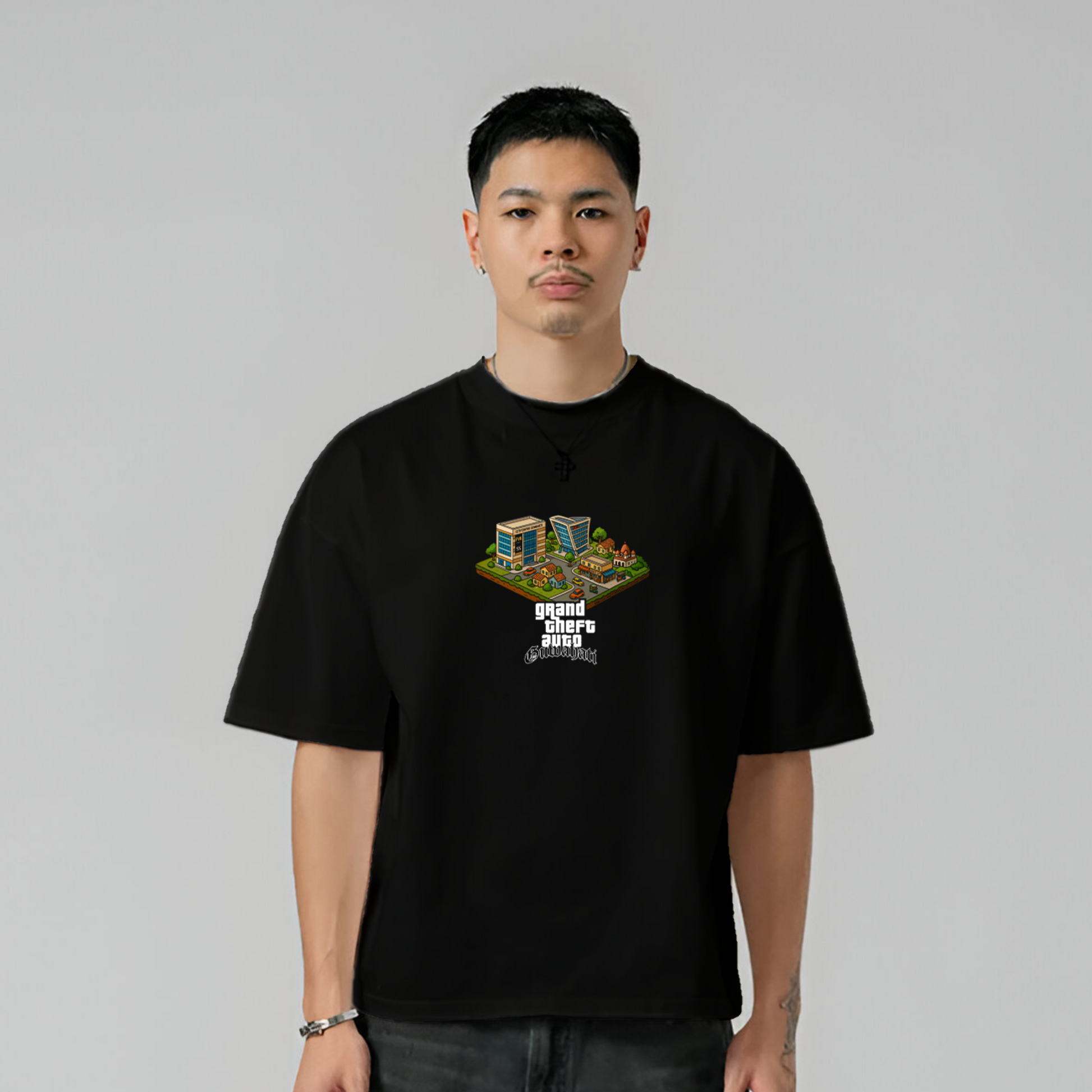 GTA Guwahati fuses retro gaming with the raw spirit of Assam. From Pan Bazaar to Beltola, this pixel-art tee captures the city’s chaos, charm, and culture. Street food, alleys, late-night adda — every thread echoes Guwahati. For those who walk the city like a playground and wear their roots with pride.