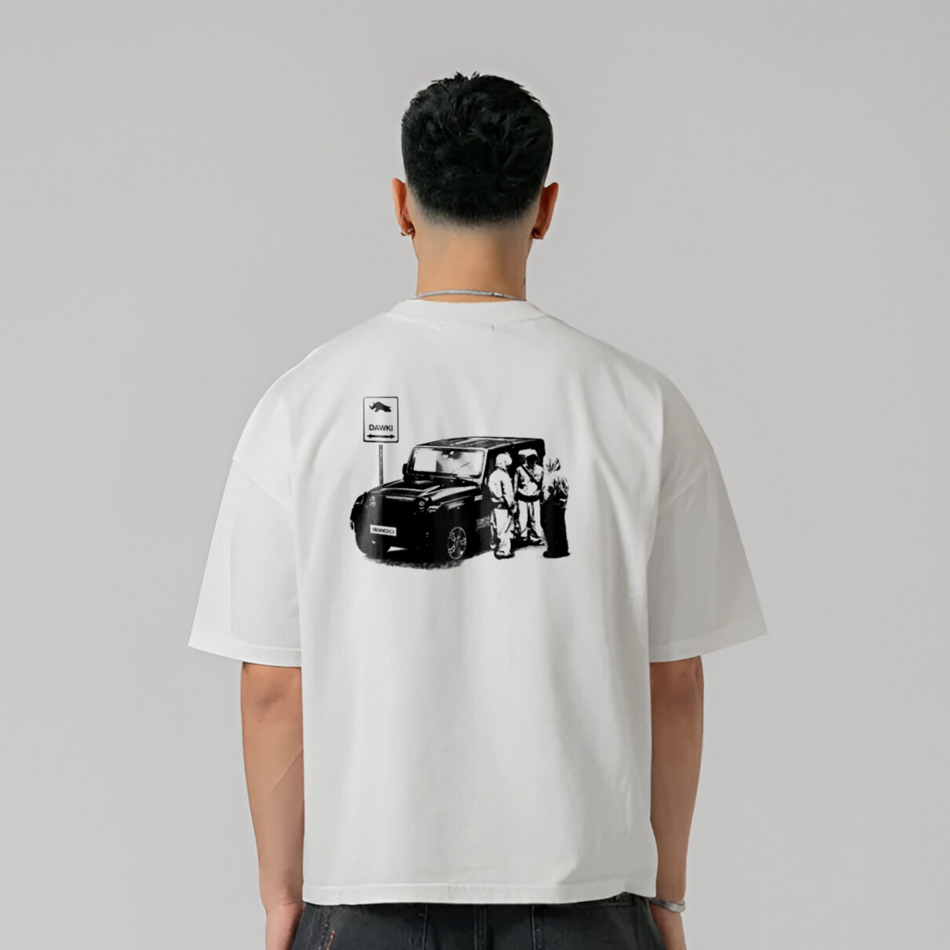 Three friends waiting by their Thar on a highway—symbolizing freedom, fun, and adventure. This contemporary design celebrates youthful journeys, late-night drives, and friendships built on endless road stories and shared escapes.